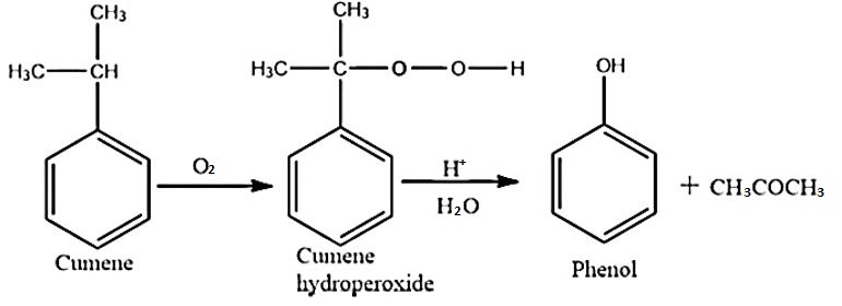 The correct answer is Option (2) → Phenol Cumene process is used industrially to prepare phenol. $\text{Cumene} \rightarrow \text{Cumene hydroperoxide} \rightarrow \text{Phenol} + \text{Acetone}$ Option 1: Ethanol Prepared by fermentation or hydration of ethene. Not from cumene. Option 2: Phenol Cumene oxidation followed by acid treatment gives phenol. This is the main industrial method. Option 3: Propanone Acetone is also produced in cumene process but it is a by-product. Main important compound is phenol. Option 4: Propene Used to make cumene, not obtained from it. |