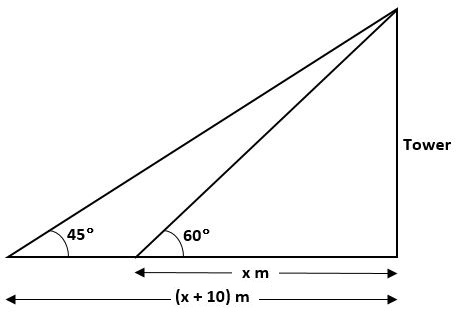 The correct answer is Option (3) → 23.65 m Given: Initial angle of elevation = 60° Let height of tower = $h$ From first triangle: $\tan 60^\circ = \frac{h}{x} \Rightarrow \sqrt{3} = \frac{h}{x} \Rightarrow h = x\sqrt{3}$ From second triangle: $\tan 45^\circ = \frac{h}{x + 10} \Rightarrow 1 = \frac{h}{x + 10} \Rightarrow h = x + 10$ Equating both expressions for $h$: $x\sqrt{3} = x + 10$ $x(\sqrt{3} - 1) = 10$ $x = \frac{10}{\sqrt{3} - 1} \cdot \frac{\sqrt{3} + 1}{\sqrt{3} + 1} = \frac{10(\sqrt{3} + 1)}{2}$ $x = 5(\sqrt{3} + 1)$ Now, $h = x\sqrt{3} = 5(\sqrt{3} + 1)\sqrt{3} = 5(\sqrt{9} + \sqrt{3}) = 5(3 + \sqrt{3})$ |