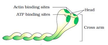 The correct answer is Option (3) – A-Actin binding sites Each myosin (thick) filament is also a polymerised protein. Many monomeric proteins called Meromyosins constitute one thick filament. Each meromyosin has two important parts, a globular head with a short arm and a tail, the former being called the heavy meromyosin (HMM) and the latter, the light meromyosin (LMM). The HMM component, i.e.; the head and short arm projects outwards at regular distance and angle from each other from the surface of a polymerised myosin filament and is known as cross arm. The globular head is an active ATPase enzyme and has binding sites for ATP and active sites for actin. Myosin monomer (Meromyosin) |