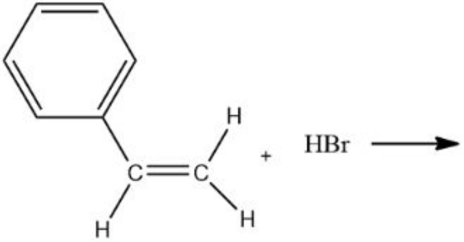 The correct answer is Option (4) → Addition of hydrogen halides: An alkene is converted to corresponding alkyl halide by reaction with hydrogen chloride, hydrogen bromide or hydrogen iodide $ \text{C}_6\text{H}_5\text{-CH}=\text{CH}_2+\text{HBr}\rightarrow\text{C}_6\text{H}_5\text{-CH}(\text{Br})\text{-CH}_3 $ This follows Markovnikov rule because no peroxide is present. Bromine attaches to the carbon that forms the more stable carbocation (benzylic position) |