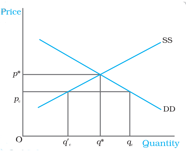 The correct answer is Option 2: pc , p* The equilibrium price and quantity of wheat are p* and q* respectively. When the government imposes price ceiling at $p_C$ which is lower than the equilibrium price level, there will be an excess demand for wheat in the market at that price. The consumers demand $q_c$ kilograms of wheat whereas the firms supply $q'_c$ kilograms. Thus, Excess demand exists at price pc and equilibrium is at price p*.