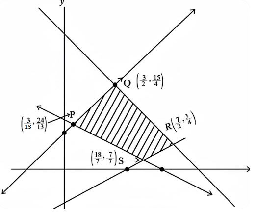 The correct answer is Option (2) → Max: 9, Min: $\frac{12}{7}$ Here, corner points are given as follows: $R\left(\frac{7}{2}, \frac{3}{4}\right), Q\left(\frac{3}{2}, \frac{15}{4}\right), P\left(\frac{3}{13}, \frac{24}{13}\right) \text{ and } S\left(\frac{18}{7}, \frac{2}{7}\right).$ Now, evaluating the value of $Z$ for the feasible region $RQPS$.