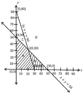 From the graph: Region A (shaded triangular-like region with vertices at $(0,0)$, $(30,0)$, $(20,30)$, and $(0,50)$) satisfies all the constraints. Hence, The feasible region is Region A |