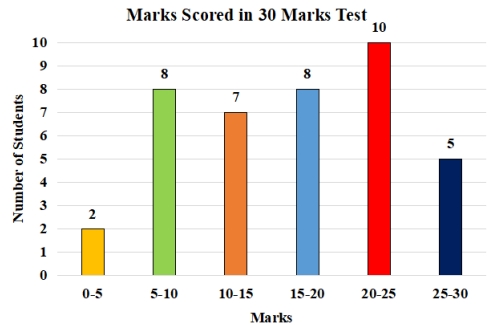The histogram shows the marks scored by 40 students in a test with maximum 30 marks. What is the percentage of the students who scored less than 20 marks? |