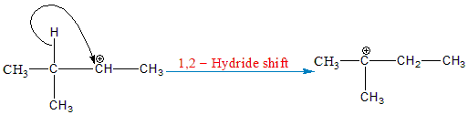 Step 3: Third step is the rearrangement of less stable secondary carbocation to more stable tertiary carbocation through 1,2-hydride shift.