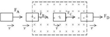 A square loop of copper wire is pulled through a region of uniform magnetic field as shown. Rank the pulling forces $F_A,F_B, F_C$ and $F_D$ that must be applied to keep the loop moving with constant speed $(\vec v)$: |