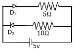 The correct answer is Option (3) → 1.0 A Battery = $5\ \text{V}$ $D_{1}$ is forward biased (conducting), $D_{2}$ is reverse biased (off) Only the upper branch ($5\ \Omega$) conducts. $I=\frac{V}{R}=\frac{5}{5}=1\ \text{A}$ |