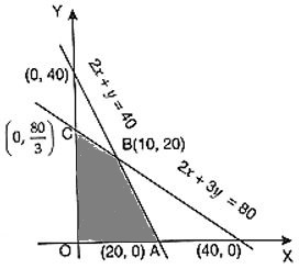 The correct answer is Option (2) → 10 items of model A and 20 items of model B, with a maximum profit of ₹350. Since each man skilled or semi-skilled works for atmost 8 hours per day and 5 skilled men and 10 semi-skilled men are employed, so the maximum number of skilled working hours available $= 5×8=40$ and maximum number of semi-skilled working hours available $= 10 × 8 = 80$. If x items of model A and y items of model B are made, then the LPP is maximise $Z = 15x + 10y$ subject to constraints $2x + y ≤ 40, 2x + 3y ≤ 80, x ≥ 0, y ≥ 0$. We draw the straight lines $2x + y = 40$ and $2x + 3y = 80$ and shade the region satisfied by the above inequalities. The shaded region shows the feasible region which is bounded. The point of intersection of the lines 2x + y = 40 and 2x + 3y = 80 is B (10, 20). The corner points of the feasible OABC are O (0, 0), A(20, 0), B(10, 20) and $C(0,\frac{80}{3})$. The optimal solution occurs at one of the corner points. At $O(0, 0), Z =15 × 0 + 10 × 0 = 0;$ at $A (20, 0), Z =15 × 20 + 10 × 0 = 300;$ at $B (10, 20) Z = 15 × 10 + 10 × 20 = 350;$ at $C(0, \frac{80}{3}), Z = 15 × 0 + 10 × \frac{80}{3}=\frac{800}{3}=266\frac{2}{3}$ We find that the value of Z is maximum at B (10, 20). Hence, the manufacturer should produce 10 items of model A and 20 items of model B to get maximum profit of ₹350. |