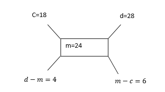 The correct answer is option (4) : 18% = 40 kg and 28% = 60 kg Given, Total quantity of wheat = 1 quintal $= 100 \, kg $ $c= 18$% profit $m= 24$% profit $d= 28$% profit $∴\frac{\text{Quan. of wheat at 18% profit}}{\text{Quan. of wheat at 28% profit}}=\frac{d-m}{m-c}=\frac{4}{6}=\frac{2}{3}$ So, quan of wheat sold at 18% profit $=\frac{2}{5}×100= 40\, kg $ at 28% profit $=\frac{3}{5}×100= 60 kg $ |