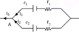 The correct answer is Option (2) → \( \frac{\varepsilon_1 r_2+\varepsilon_2 r_1}{r_1+r_2} \) As both cells are connected in parallel and the resistance are also connected in parallel. Then, $I_3=I_1+I_2$ ...(1) [According to kirchhoff Junction] and, $I_1=\frac{ε_1}{r_1},I_2=\frac{ε_2}{r_2}$ $I_3=\frac{ε_{eq}}{r_{eq}}$ Replacing these value in eq. (1) $\frac{ε_{eq}}{r_{eq}}=\frac{ε_1}{r_1}+\frac{ε_2}{r_2}$ ...(2) Ans, as resistance are connected in parallel. $\frac{1}{r_{eq}}=\frac{1}{r_1}+\frac{1}{r_2}$ $r_{eq}=\frac{r_1+r_2}{r_1+r_2}$ Putting $r_{eq}=\frac{r_1+r_2}{r_1+r_2}$ in eq. (2) $ε_{eq}=\left(\frac{r_1r_2}{r_1+r_2}\right)\left(\frac{ε_1}{r_1}+\frac{ε_2}{r_2}\right)$ $=\frac{r_1r_2}{r_1+r_2}+\frac{ε_1r_2+ε_2r_1}{r_1r_2}$ $ε_{eq}=\frac{ε_1r_2+ε_2r_1}{r_1+r_2}$ |