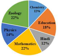 Combined strength of Physics and Mathematics = 14% + 22% = 36% By solving one by one for each option , 1. Zoology and Chemistry Combined strength of Zoology and Chemistry = 22% + 12% = 34% 2. Hindi and Education Combined strength of Hindi and Education = 18% + 12% = 30% 3. Zoology and Education Combined strength of Zoology and Education = 22% + 18% = 40% 4. Hindi and Zoology Combined strength of Hindi and Zoology = 12% + 22% = 34% So , combined strength of Zoology and Education is more than combined strength of Physics and Mathematics.