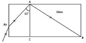 A light ray from air is incident on a glass slab (μ = 1.5) as shown in the figure. It undergoes a total internal reflection and travels along AB. The thickness AC of the glass slab is 20 cm. The time taken by light to cross the glass slab after reflection is |