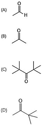 The correct answer is Option (2) → (C), (D), (B), (A) HCN adds to carbonyl compounds via nucleophilic addition. Reactivity depends on: • Steric hindrance • +I effect of alkyl groups More bulky alkyl groups → Less reactivity Aldehydes react faster than ketones because: • Less steric hindrance • Less electron donation Reactivity order: Highly bulky ketone < Moderately bulky ketone < Simple ketone < Aldehyde Identify the compounds