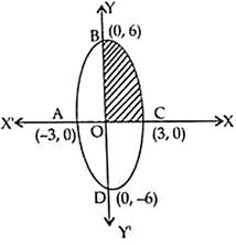 The correct answer is Option (3) → $18\pi$ sq units Given curve is $4x^2 + y^2 = 36$ or, $\frac{x^2}{9} + \frac{y^2}{36} = 1$ or, $\frac{x^2}{3^2} + \frac{y^2}{6^2} = 1$ since, ellipse is symmetrical along x-axis and y-axis. $\text{Area of ellipse} = \text{Area of ABCD}$ $= 4 \times \text{Area of OBC}$ $= 4 \times \int\limits_{0}^{3} y dx$ $= 4 \times \int\limits_{0}^{3} (2 \sqrt{9 - x^2}) dx$ $= 8 \int\limits_{0}^{3} \sqrt{9 - x^2} dx$ [since, OBC is above x-axis] $= 8 \int\limits_{0}^{3} \sqrt{3^{2} - x^{2}} \, dx$ $= 8 \left[ \frac{x}{2} \sqrt{3^{2} - x^{2}} + \frac{3^{2}}{2} \sin^{-1} \frac{x}{3} \right]_{0}^{3}$ $= 8 \left[ \frac{x}{2} \sqrt{9 - x^{2}} + \frac{9}{2} \sin^{-1} \frac{x}{3} \right]_{0}^{3}$ $= 8 \left[ 0 + \frac{9}{2} \sin^{-1}(1) - (0 + 0) \right]$ $= 8 \times \frac{9}{2} \times \frac{\pi}{2}$ $= 2 \times 9\pi$ $= 18\pi \text{ sq. units}$ |