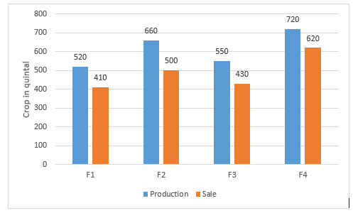 The given bar graph represents the production and sales of a certain crop in quintals by the farmers F1, F2, F3 and F4. What is the ratio between the total sales and total production by all farmers? |