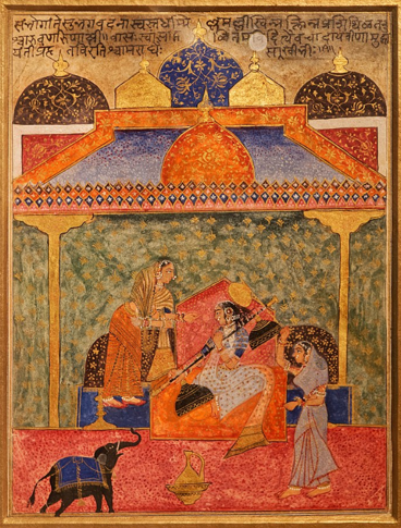 The correct answer is Option (1) → (A) and (C) only An intriguing work in the collection of National Museum, New Delhi, titled Ragini Pathamsika of Raga Hindola, an important member of the Ragamala family of the Indian musical mode, dates back to around 1590–95. Some scholars believe it to be from Bijapur, an important state of Deccan. Persian influence is obvious in the painting. This is seen in the arabesque decoration on the surface of the two domes that delineate the upper part of the painting, where letters written in Devanagari script cover the space. Two beautifully dressed and bejewelled women are seen in the pavilion, while the third is seen outside it. The centrally placed female musician is playing an Indian instrument, which appears to be veena, while the other two on the sides appear to be accompanying with rhythmic sway of their bodies. The colours are vibrant. Red is dominant and is complimented by green. |