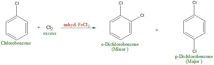 What happens when chlorobenzene reacts with excess chlorine in the presence of anhydrous FeCl3 (Major product)? |