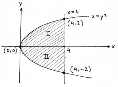 $x=y^2, ~~x=4$ for $x=4$ $y^2=4$ $y= \pm 2$ point of Intersection of $x=4~~~y^2=x$ are $(4,2)$ and $(4,-2)$ cercus is symmetrical about x axis area of port I = area of port II area of figure (Ar.) = 2 × area of port I Ar. = $2 x \int\limits_0^4 \sqrt{x} d x$ $x=y^2$ $\Rightarrow y=\sqrt{x}$ Ar. = $2 \int\limits_0^4 x^{1 / 2} d x =2\left[\frac{x^{1 / 2+1}}{\frac{1}{2}+1}\right]_0^4=2\left[\frac{x^{3 / 2}}{\frac{3}{2}}\right]_0^4$ $=\frac{2 \times 2}{3} \times 4^{3 / 2}-0$ Ar. = $\frac{4}{3} \times 8=\frac{32}{3}$ |