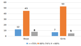The given bar chart shows the number of students in a class who have secured marks in three ranges: >=75%, 60%-74% and <60% From the given information, identify the per cent of boys who got distinction. |