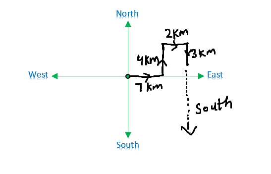 Pratap starts from school and walk 7 km towards East. He takes left and walks 4 km then takes a right and walk 2 km. Again takes a right and walks 3 km. Which direction is he facing now? |