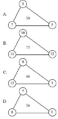 THE LOGIC FOLLOWED HERE IS SUM OF OUTER NUMBER × 2 = INNER NUMBER IN FIG A (7 + 3 + 5 ) × 2 = 15 × 2 = 30 IN FIG B (14 + 10 + 12 ) × 2 = 36 × 2 = 72 IN FIG C (13 + 9 + 1 ) × 2 = 23 × 2 = 46 SIMILARLY IN FIG D (8 + X + 6 ) × 2 = 36 14 + X = 18 X = 18 - 14 X =4 |