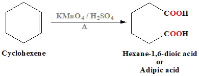 The correct answer is option 1. \(KMnO_4/H_2SO_4. \, \ \Delta \). Let us go through the explanation of how cyclohexene is converted into hexane-1,6-dioic acid using \(KMnO_4/H_2SO_4, \, \ \Delta\). Understanding the Reagents: Potassium Permanganate \((KMnO_4)\): A strong oxidizing agent, especially in acidic conditions. It is commonly used to oxidize alkenes, converting them into diols, ketones, aldehydes, or carboxylic acids depending on the reaction conditions. Sulfuric Acid \((H_2SO_4)\): Provides the acidic environment necessary for the oxidation reaction to proceed. \(\Delta\): Indicates that heat is applied, which is often necessary to drive the reaction to completion, especially when breaking carbon-carbon bonds. Reaction Process: Cyclohexene is a cyclic alkene with the structure of a six-membered ring containing one double bond. When cyclohexene is treated with \(KMnO_4\) in the presence of \(H_2SO_4\) and heat, the double bond in the cyclohexene is oxidatively cleaved. The double bond in cyclohexene is broken, leading to the formation of two carboxylic acid groups at the positions where the double bond was originally located. The oxidation reaction converts the six-membered ring of cyclohexene into a linear molecule, specifically hexane-1,6-dioic acid (also known as adipic acid). This molecule has two carboxylic acid groups (\(-COOH\)) at the first and sixth carbon positions.