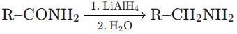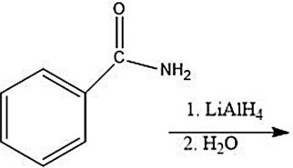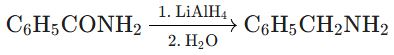 The correct answer is Option (4) → The reaction shown is the reduction of an amide (Benzamide) using Lithium Aluminium Hydride ($LiAlH_4$) followed by hydrolysis. Reaction Analysis Reactant: The starting material is Benzamide ($C_6H_5CONH_2$), which is a primary amide. Reagent ($LiAlH_4$): Lithium Aluminium Hydride ($LiAlH_4$) is a powerful reducing agent. Process: LiAlH4 reduces the carbonyl group (C=O) of the amide to a methylene bridge ($–CH_2–$), while leaving the C–N bond intact. Product: The final product is the corresponding primary amine. When Benzamide is reduced, the product is Benzylamine (Phenylmethanamine). The reaction is: The Product The product in the following reaction is Benzylamine. |