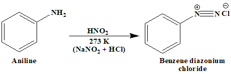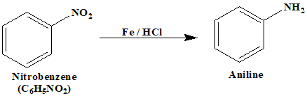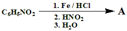 The nitro group (\(-NO_2\)) in \(C_6H_5NO_2\) (nitrobenzene) is reduced to an amine group (\(-NH_2\)) using iron and hydrochloric acid. This step converts nitrobenzene to aniline (\(C_6H_5NH_2\)). Diazotization with \(HNO_2\) (Nitrous acid):
