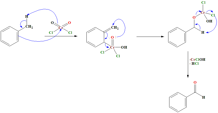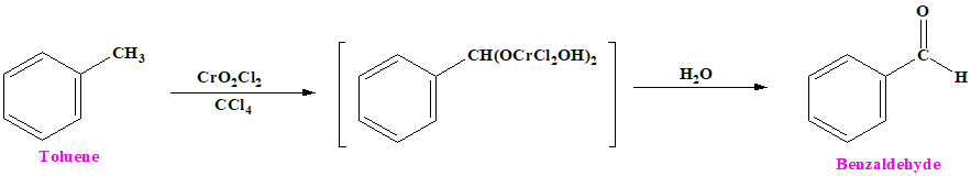 The correct answer is option 1. Aromatic aldehyde. The reaction begins with an alkene – allylic hydrogen reaction with chromyl chloride, forming a precipitate called the Etard complex. This Etard complex is then decomposed with the help of a reducing environment to prevent its oxidation into a carboxylic acid. This reducing environment is generally provided by a saturated solution of aqueous sodium sulphite. Carbon tetrachloride is the most commonly used solvent for this method but carbon disulfide and chloroform can also be used as solvents. Aldehyde product of high purity can be obtained by purifying the Etard complex before its decomposition (so that its reaction with the unreacted reagent is prevented). The time frame for this equation may vary from a few days to several weeks but the yields are relatively high.