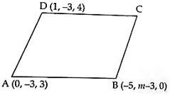 Three vertices A, B, C and D of a parallelogram ABCD are given by, $A(0, -3, 3), B(-5, m - 3, 0)$ and $D(1, -3, 4)$. The area of the parallelogram ABCD is 6 sq. units. Using vector method, find the value(s) of $m$. |