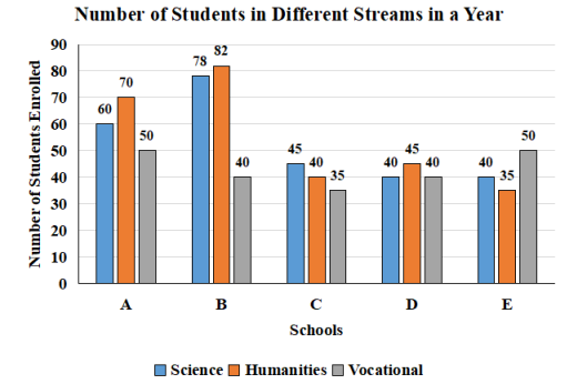 Number of students enrolled in science in school A = 60 Total number of students of all the five school from all branches = ( 60+70+50 ) + ( 78+82+40 ) + ( 45+40+35 ) + ( 40+45+40 ) + ( 40+35+50 ) = 180 + 200 + 120 + 125 + 125 = 750 Percentage of number of students in science in school A to total number of students of all the five school from all branches = \(\frac{60 }{750}\) × 100 = \(\frac{4 }{50}\) × 100 = 8% |