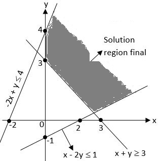 The region represented by the system of inequalities $x, y ≥ 0 ;-2 x+y ≤ 4 ; x+y ≥ 3$ and $x-2 y ≤ 2$ is : |