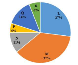 The pie chart given below shows the number of girls in six schools. The total number of girls in all these six schools are 8000. Number of girls in a particular school is shown as a percentage of total number of girls in all these six schools. What is the difference between the central angle formed by sector M and Q? |
