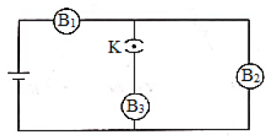 B1, B2 and B3 are the three identical bulbs connected to a battery of steady emf with key K closed. What happens to the brightness of the bulbs B1 and B2 when the key is opened ? |