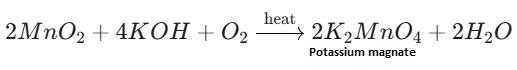 The correct answer is Option (2) → (C), (D), (B), (A) Preparation of $KMnO_4$ is done from $MnO_2$ in two major stages: Step 1: Oxidation of $MnO_2$ to manganate $(K_2MnO_4$) by fusion with KOH and an oxidizing agent like $KNO_3$ Step 2: Conversion of manganate into permanganate by disproportionation in acidic or neutral medium Option 2: (C), (D), (B), (A) This starts correctly with $MnO_2$ as the raw material. It is fused with alkali metal hydroxide and $KNO_3$ which oxidizes $MnO_2$. This produces dark green $K_2MnO_4$. Finally, manganate undergoes disproportionation in acidic or neutral solution to form $KMnO_4$. Thus, this is the correct preparation sequence. |