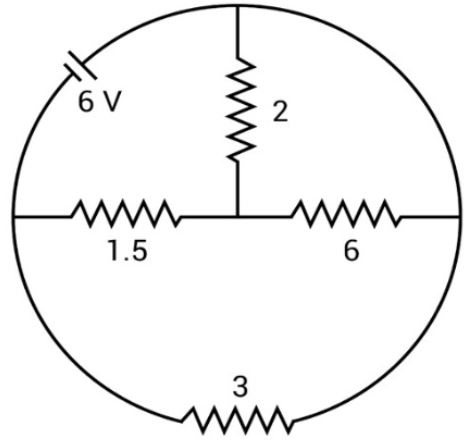 In the circuit resistors of 2$\Omega$ and $6\Omega$ are in parallel its equivalent is $\frac{2 \times 6}{2+6}\Omega = 1.5\Omega$ $1.5 \Omega$ is in series with resistor of $1.5 \Omega$, Its equivalent is $3 \Omega$. Now both resistances of 3 $\Omega$ are in parallel so equivalent resistance is $R_{eq} = 1.5 \Omega$ Current $I = \frac{6 V}{1.5 \Omega} = 4A$ |