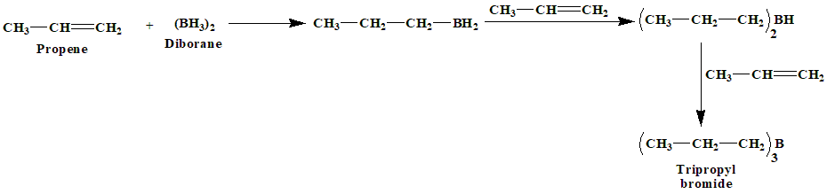 The correct answer is option 2. Diborane. Hydroboration is the key reaction involving diborane and alkenes. This process is used to add boron across the double bond of an alkene, leading to the formation of organoboranes (trialkylboranes in this case). Diborane (\( \text{B}_2\text{H}_6 \)) first reacts with the alkene (propene) to form a cyclic intermediate. In this intermediate, the boron atom bonds to the carbon atoms of the double bond, with one of the hydrogen atoms from the diborane attaching to each of the carbon atoms initially involved in the double bond. The reaction of diborane with propene results in the addition of the boron atom across the double bond of propene. The overall reaction is:
