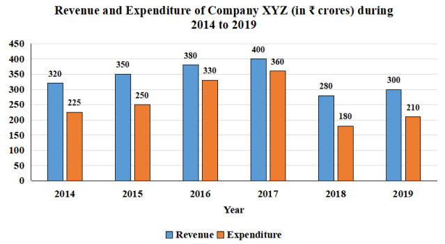 Total revenue of the company in 2014, 2016 and 2018 = 320 + 380 + 280 = 980 Total expenditure in 2015 to 2017 and 2019 = 250 + 330 + 360 + 210 = 1150 Required percentage = \(\frac{980 }{1150}\) × 100 = 85.2%