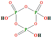 From the above structure of Cyclotrimetaphosphoric acid molecule, there are 3 \(P=O\) bonds, 3 \(P-OH\) bonds, and 3 \(O-P-O\) bonds. Hence, a total of 3 double bonds and 9 single bonds. So, Cyclotrimetaphosphoric acid molecule has 3 double bonds and 9 single bonds. |