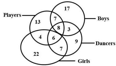 Consider the Venn diagram below, and from the given alternatives, choose the number that indicates the total number of girls who are players and dancers. |