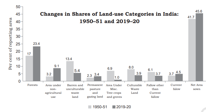 The correct answer is Option (2) → Forests Between 1950–51 and 2014–15, the area under forests in India has shown a positive increase, according to land-use statistics. This rise is largely due to afforestation programmes and the reclassification of land as forest area, even though it may not always reflect actual increase in forest cover.