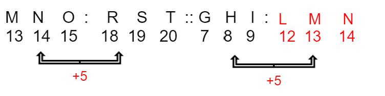 In this analogy, the difference between the corresponding letters is five. Thus, the fourth letter cluster is LMN