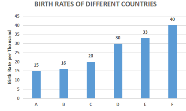Observe the following bar-graph carefully and answer the following questions: The birth rate of Country C is approximately what percentage of the birth rate of Country E? |