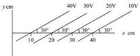 Some equipotential surfaces are shown. What is the magnitude and direction of electric field? |