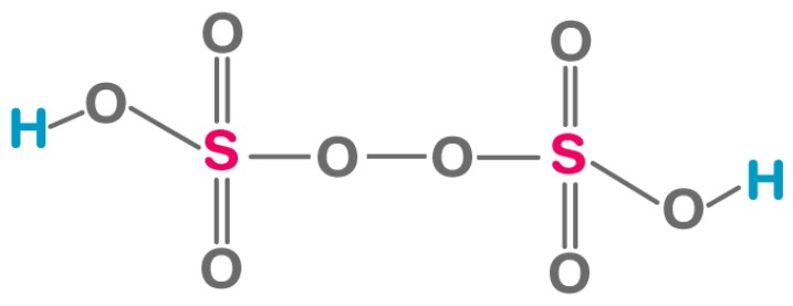 3. H₂S₂O₈ (Peroxodisulfuric acid) This acid contains an O-O bond (peroxide bond) between two oxygen atoms, which connects the two sulfur atoms. This is a key characteristic of peroxodisulfuric acid. The structure includes the S-O-O-S bond.