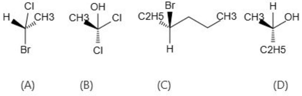 The correct answer is Option (1) → (A), (C) and (D) only (A): H, Cl, CH₃, Br → four different groups → chiral (B): CH₃, OH, Cl, Cl → two Cl groups are identical → achiral (C): H, Br, C₂H₅ (ethyl), —CH(CH₃)₂ (isopropyl) → four different groups → chiral (D): CH₃, OH, H, C₂H₅ → four different groups → chiral |