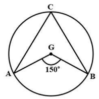 We know that, The angle made by the chord at centre is double the angle made by it in a major segment of the circle. We have, ∠AGB = 150° ∠AGB = 2 × ∠ACB = 150° = 2 × ∠ACB = ∠ACB = 75° |