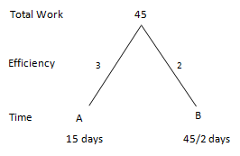 ⇒ A + B worked for 6 days = (3 + 2) x 6 = 5 x 6 = 30 units, ⇒ Remaining work = 45 - 30 = 15 units, ⇒ Remaining work is completed by C in 6 days = \(\frac{15}{C}\) = 6 days, ⇒ C = \(\frac{15}{6}\) = \(\frac{5}{2}\), (Efficiency) ⇒ A + B + C = 3 + 2 + \(\frac{5}{2}\) = \(\frac{15}{2}\), ⇒ Time required by A + B + C to complete the total work = \(\frac{45}{15/2}\) = 6 days. ..(\(\frac{Work}{Efficiency}\) = Time) |