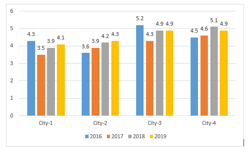 The following graph shows the sales of cars (in thousands)in four cities in 4 years. Study the graph and answer the question.
