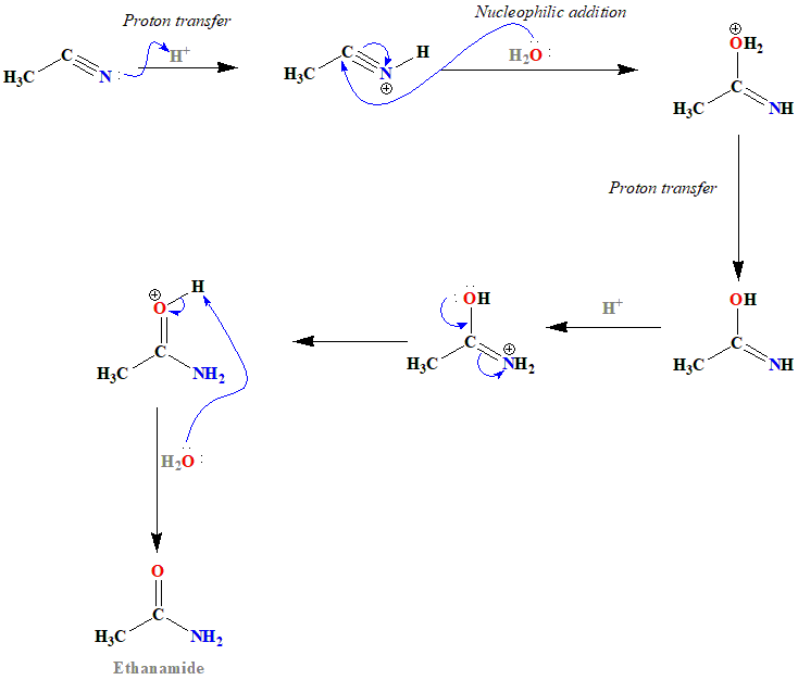 Methyl nitrile is hydrolyzed to carboxylic acid in the presence of \(H_3O^+\) as catalyst. An intermediate compound \([A]\) is formed during this reaction.